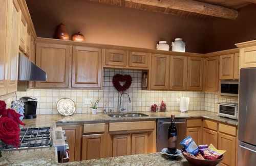 The home is a custom built, split-level Santa Fe Style home with 12 foot latillas & vigas ceilings, kiva fireplace, and saltillo tile and brick floors throughout. There is a covered Portal for relaxing, outdoor fire pit, and huge windows for taking in the big mountain views. The home has an open plan with contemporary furnishings and outstanding art and sculptures purchased from local artists and galleries. This is no ordinary rental, but a stylish, beautifully furnished personal home filled with quality furnishings, art, and treasures