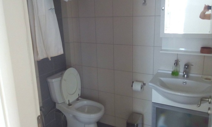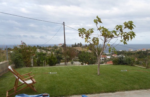 The perfect studio for summer and winter short time vacations. Simple decoration and furniture, very sunny, unblocked view to mountain and sea, great front yard with grass and flowers (roses).Very spacious, ideal for one couple with one children. The place is inside a full of trees and clean environment, among olive trees. Very quite place without neighbors in touch. For local movements a car is needed.