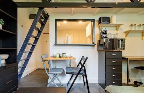 The mezzanine, accessible by a ladder, houses a double bed (140 cm) and a closet, creating a cozy and practical sleeping area.