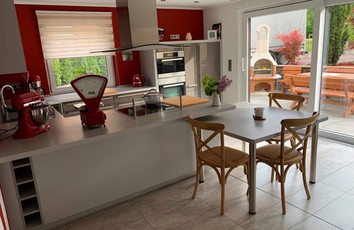 The house (up to 6 persons with 3 bedrooms) belongs to a semi-detached house and consists of ground floor and first floor, terrace with barbecue and seating area in the garden. In the basement there is the living room with dining area and fireplace, 1 separate fully equipped kitchen, 1 bathroom with shower / WC and a utility room with washer and dryer. Upstairs leads a staircase. Upstairs are all 3 bedrooms (2 x double beds, 1 x 2 single beds, which can also be put together) and the large bathroom with walk-in shower, free-standing bath and toilet. The equipment of the entire apartment is modern and comfortable. Bed linen / towels are included in the price, as are all utilities, such as electricity, water, heating, wood for fireplace. The price for the final cleaning is 150,00 € and is payable locally in cash. W-LAN is available free of charge.