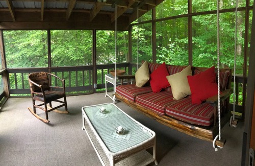 Step upstairs to the loft area where an interior balcony overlooks the main living area or enjoy the beauty of the woods through the large upper windows. Enter the loft bedroom to find a king bed and half bath.