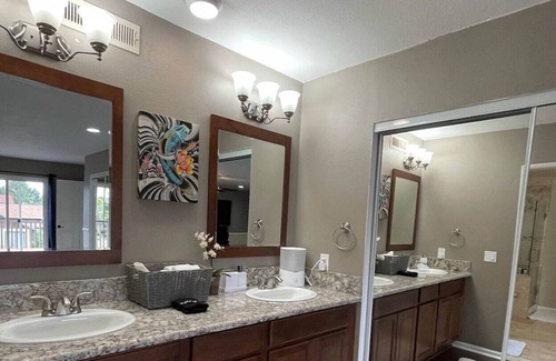 Large 2 Story House has 2 Master bedrooms. The Upstairs Master is Massive 20x20 occupying the whole 2nd story. The Downstairs master is 12x10 has a sliding glass door opening up to the private backyard and pool with covered patio. Full Kitchen with all essentials. Pool Table with new accessories. New Gas BBQ & Patio Furniture. Big screens Smart Tv's with Disney+, Netflix, Amazon & Alexa, & Xbox. Super Fast Wifi and Full Size Washer and Dryer. Weekly Gardening and Pool Service. House is professionally cleaned. Located less than 8 miles from the beach. Pool is perfect for hot sunny summer days.