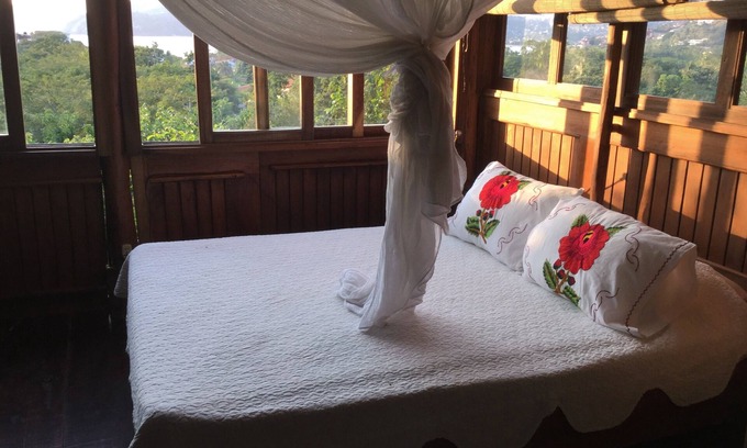 Butterflies abound. There is a panaramic view from the bedroom and every room in the house you can see the bay,sunsets, moonsets, parrots flying over and listen to the sound of the waves at night. The house is on one floor but dont worry you will still get exercise. For your convience there is maid service everyday, wireless internet, cell phone and fans. Bring your i pod. There is a lot of colorful folk art and paintings. The house is constructed using native tropical woods, palapa roofs and accents of native woods.