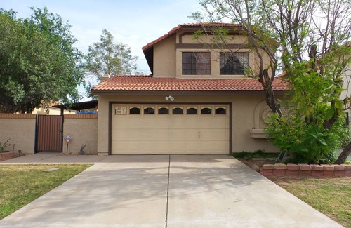 Settled in the oasis of the area, this spacious 2000 square foot Glendale home is perfect for families or groups of friends to experience the best of the Phoenix and Glendale areas! This 3-bedroom 2.5-bathroom and a loft vacation rental features a full kitchen, 2 living spaces with 70-inch Smart TVs, a laundry room, inviting green grass front yard, mature tree courtyard, a covered patio, and a backyard, making your trip the most enjoyable.