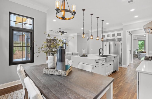 This charming home features five beautifully appointed bedrooms, including one king bed, three queen beds, and one bunk bed, accommodating up to 12 guests comfortably. Each of the five bathrooms comes equipped with modern amenities such as a shower, bidet, and bathtub, ensuring everyone enjoys a relaxing stay. Additional amenities include air conditioning, washer and dryer facilities, WiFi for seamless connectivity, and an option to rent an over-the-garage suite that accommodates two more guests, offering flexibility for your wedding party. Your experience can be further enhanced by considering the sports yacht rental on Lake Norman, perfect for a romantic day or family fun on the water.