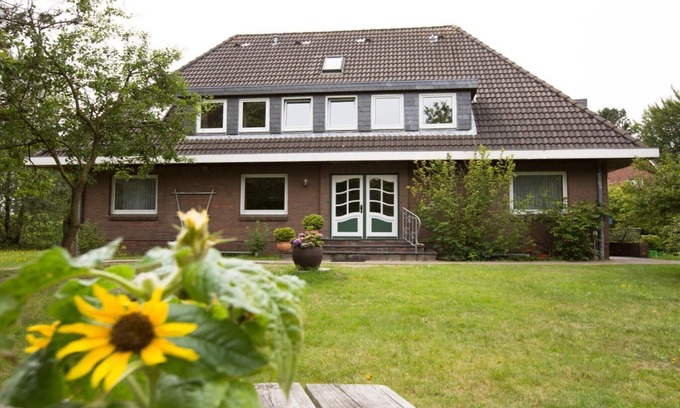 The Tadsen holiday home is located near Süddorfer Strand, on Sösarper Strunwai 23, on a large heath and forest plot. On the 5,000 sqm plot of land there are terraces with garden furniture and beach chairs that invite you to linger in the garden. The house is equipped with WiFi. Apartment 1 is located on the ground floor of the house