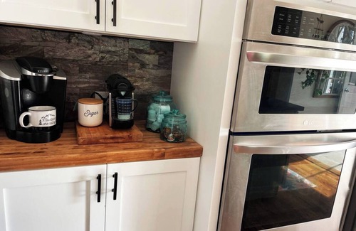 Enjoy a coffee or espresso at the coffee bar. Electric stove, oven and convection oven/microwave. Farmhouse sink with large sliding window to take in the fresh mountain air. The door from the kitchen opens up to the back deck. Kitchen bar seating for two along with a kitchen table with seating for four.