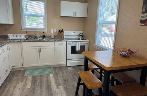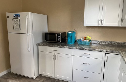 The kitchen includes a refrigerator, stove, microwave, Keurig coffeemaker, blender, toaster, cookware, pots and pans, wine glasses, and a wine opener. There are plenty of dishes and silverware for a nice dinner or a family breakfast. You will also find coffee, creamer, sugar, green tea, hot chocolate, oil, salt, and pepper.