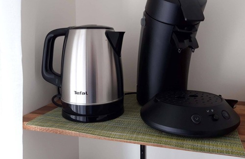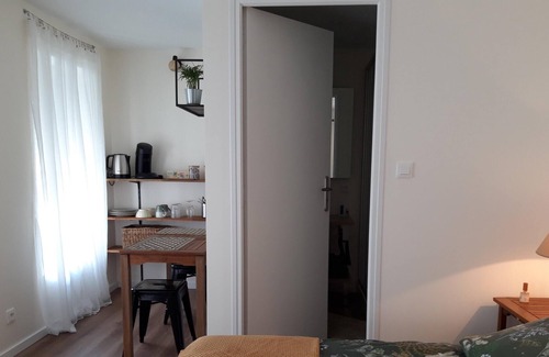 The room has the necessary equipment to take small meals independently (kettle, coffee, tea, sugar, crockery. Carrefour City and several bakeries, caterers, cheese makers, greengrocers are at the foot of the accommodation).