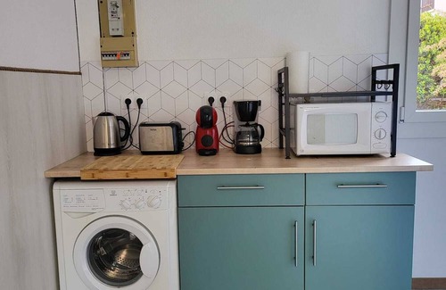 The kitchenette is equipped with an oven, a stovetop, and a refrigerator, as well as a coffee maker, an electric kettle, and a microwave. And you can even travel light because you'll have access to laundry facilities. Other amenities include housekeeping, heating, and a dining table.