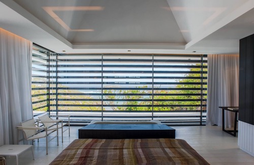 The villa’s four bedrooms all offer ocean views. The master bedroom, located on the upper floor, is particularly spacious and features a double walk-in shower, a desk, a dressing room, a sitting area and a large private terrace. Two bedrooms are on the main level of the villa, while the other two are on the lower level, all with their own terrace.
