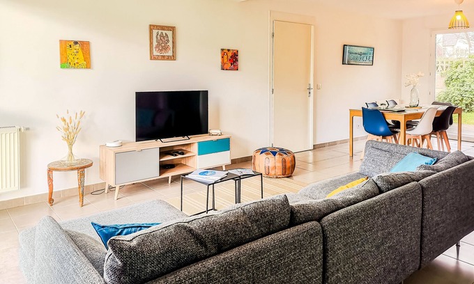 Located in a quiet subdivision on a one-way street, our house is a few minutes' walk from shops (supermarkets, bakeries, restaurants, pharmacy, post office, etc.). The beaches of Lancieux are a 7-minute drive away, and the cities of Saint-Malo, Dinard, and Dinan are easily accessible in less than 20 minutes by car.