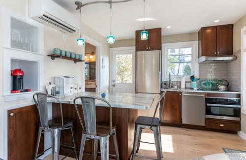 The kitchen is nicely appointed with high-end appliances: fridge, a 3-burner induction cooktop, a combination microwave & convection oven, and dishwasher. The breakfast bar makes that morning coffee oh so convenient – everything’s right at your fingertips: Keurig coffee maker, coffee, and cups!