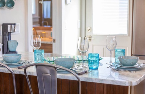 Plover’s Nest first welcomes you with outdoor gathering spaces – Adirondack chairs and bistro dining on the covered deck … and you haven’t even opened the door yet! As you enter Plover’s Nest, the home opens to a beautiful kitchen, comfy breakfast bar, and cozy living room.