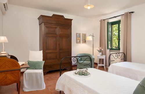 Podere Capanne develops entirely on the first floor. Going up the terracotta stairs, you access the property by entering the living room connected, through an arched opening, to the dining room and the built-in kitchen. Following is a double bedroom with ensuite bathroom with shower, another double bedroom and a twin bedroom with joinable beds and a further bathroom with shower. The floor is completed by the laundry room. The ground floor is not available to guests. Air conditioning only in the bedrooms.