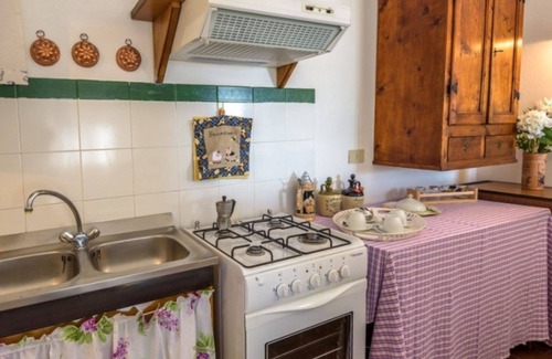 The Glicine apartment, located on the ground floor of the farmhouse, overlooks the house's jasmine pergola. The Glicine apartment consists of a living room and kitchenette, double bedroom, bathroom with shower and a handy storage room. Outside, a comfortable iron table with chairs allows outdoor dining under the pergola.