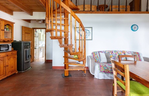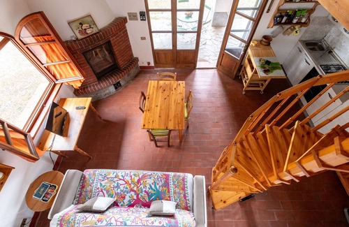 5-room house 120 m2 on 2 levels. Cosy furnishings: living/dining room with open-hearth fireplace, dining table, TV, wood-burning stove and air conditioning. Exit to the terrace. Living room with open-hearth fireplace, dining table, kitchen corner, TV and air conditioning. Exit to the terrace. 1 room with 1 double bed (200 cm). 1 room with 1 bed and 1 double bed (160 cm). Open kitchen (oven, dishwasher, 6 gas rings, toaster, kettle, microwave, electric coffee machine). Exit to the terrace. 2 showers/bidet/WC. Upper floor: (spiral staircase) open gallery with sloping ceilings with 3 beds. (spiral staircase) open gallery with sloping ceilings with 3 beds. Wood heating, forced-air heating. Heating not available in all rooms. Terrace roofed. Terrace furniture, barbecue, deck chairs. Very beautiful panoramic view of the countryside. Facilities: washing machine, iron, baby cot for up to 2 year olds, hair dryer. Internet (WiFi, free). Parking. Please note: non-smokers only. Maximum 2 pets/ dogs allowed. Private entrance. No internal connecting door between the separated properties. IT053007C2KFV6TISP,IT053007C2VMRBJJKF