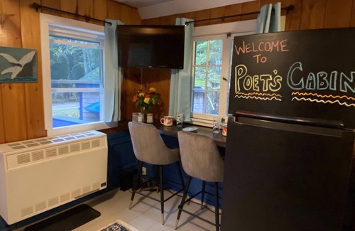 Poet's Cabin is a one bedroom, one bath classic "A-Frame" cabin. The interior decor features beautiful pine wood walls and Acadia-inspired art throughout the house. The loft bedroom (full standing height) features a brand new queen-sized Brentwood bed and storage, and the living room features a new velvet sleep sofa for multiple sleeping options. The living room also features a live-edge walnut wood breakfast bar with two comfortable seats with a view of the woods, as well as a new Roku TV with excellent, 500 mbps fiber optic wifi internet throughout the house. The cabin has a full kitchen with a full sized refrigerator with freezer, and brand new stainless steel appliances including electric stove/oven, dishwasher, and microwave. There is also a warm and powerful Rinnai heater for making it cozy. The cabin also has a 3/4 bathroom, including stall shower, sink, and brand new toilet. Finally, the cabin has a large front deck with a cedar gliding loveseat, built-in table with seating, and easy parking for two cars.