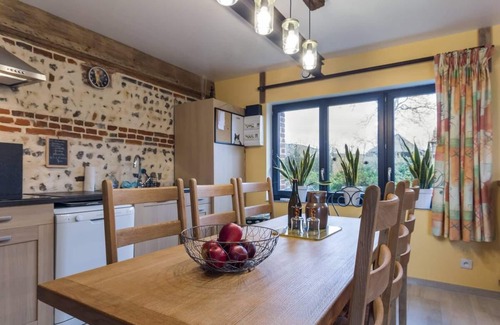 House adjoining the cottage 4 people G1409: Ground floor : Large living room with: - living room / lounge (flat screen TV, pellet stove), - fitted kitchen (oven, microwave, freezer, vitroceramic hotplates), - double room (1 double bed 160x200cm), - shower room with wc (washing machine), 1st floor : - 1 bedroom for 2 people (1 bed 160x200cm), - 1 room 3 persons (3 beds 90x190cm), - Bathroom with toilet, - small landing room (office). Heating: pellet stove + electes rooms. Mixing old and contemporary, you will be seduced by the quality of the renovation of this Norman farmhouse made by the owners. The building is located in the center of the village, close to small shops and 20 minutes walk from the beach. The building is divided into 2 gites (G1408 and G1409) that can accommodate 11 people in total: ideal for family or friends with complete independence. Private garden. Rest, tourist discovery of Normandy, rdonnée: we leave you the choice ....