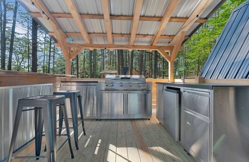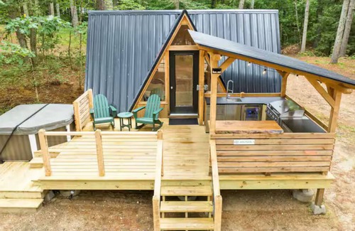 While you're here, you can enjoy all the comforts of home and more, including a private hot tub and a stovetop, as well as an outdoor entertainment area and a private deck. Other amenities include towels, a mini-fridge, kitchenware and utensils, and firewood.