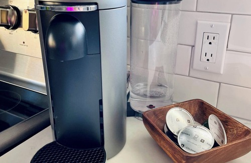 A spacious living room with a large flatscreen tv and modern boho decor welcomes you. There’s a dining and bar area next to the full kitchen featuring a Nespresso machine. The downstairs bedroom features a queen bed and ** it’s through this room that you access the full bathroom. Near the stairs you’ll find the piano and workspace.