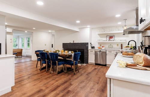 Inside, the home's classic design and comforting layout make settling in effortless. Four bedrooms and two full bathrooms offer space for families or groups, with thoughtful touches throughout: sun-drenched windows, natural textures, and just enough quirk to make it feel personal. The living room invites connection with plush seating, a piano for impromptu melodies, and a TV for low-key nights in. The open dining area is anchored by a large table where meals, conversation, and board games can stretch long into the evening.