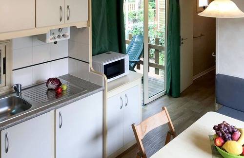 "Ponente 6", 3-room bungalow 26 m2. Practical furnishings: living/sleeping room with 1 sofabed and dining nook. Exit to the veranda. 1 room with 1 french bed (140 cm). 1 room with 2 beds (70 cm, length 185 cm), 1 x 1 bunk beds (70 cm, length 185 cm). Open kitchen (4 gas rings, microwave). Shower/WC, sep. WC. Heating, air-conditioning. Terrace 18 m2, roofed. Terrace furniture. Facilities: mosquito net, children's high chair, baby cot (extra). Maximum 1 pet/ dog allowed. The property is one of a type of property or apartment. IT049001B1KRISVGSR