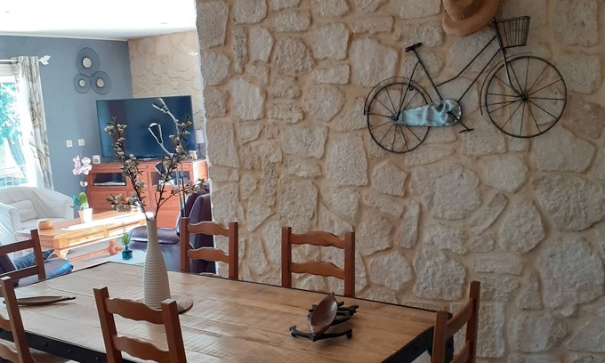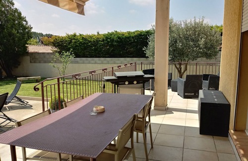 Très agréable villa à 1km du centre-village, à 20km de la Cité des Papes et du Pont d'Avignon. 20km aussi pour se rendre aux Arènes d'Arles et errer dans son théâtre antique. À moins que vous ne préfériez visiter les majestueuses Arènes de Nîmes ou la Maison Carrée (temple romain resté intact). Si vous préférez l'ambiance village provençal, parcourez les rues pavées du Duché d'Uzès et faufilez vous entre les étals du marché le samedi matin... Puis rentrez au calme et profitez de la piscine avec ses bulles thalasso. Ou alors, prélassez vous dans un transat au soleil ou à l'ombre des canisses de la pergola. Vous serez comme chez vous puisque c'est notre habitation principale. En cuisine, il ne manque absolument rien : épices, ingrédients, ustensiles, moules à gâteaux... Tout est à votre disposition ! Et en cas de besoin, Intermarché, pharmacie, presse/tabac, boulangerie... se trouvent à 1km au village. Entourés par les vignes, vous serez dans un endroit propice au repos, tout en étant proches de tout si vous préférez avoir des journées bien remplies. Vous pourrez aussi disposer du confort de la maison climatisée. Pour un bon film, il y a la TV grand écran et Canal+ ttes chaines, Netflix et Prime Vidéo. Pour surfer sur le web, la Wifi sera accessible partout. Nous serons ravis de vous recevoir et de vous montrer à quel point notre région est belle. Des animations taurines et fêtes sont prévues toute la saison dans les villages alentours selon les calendriers des mairies. Nous vous attendons !