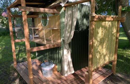 Some of the amenities include luxurious bedding, hot water outdoor shower area, 125+ year old root cellar made into private dining space with coffee/tea setup, fridge and cook top. Firepit with firewood, several outdoor seating areas with lots of colorful cushions. Rope swing, games and fishing pole for the kids. Plus so much more!