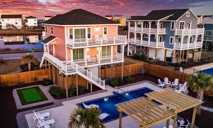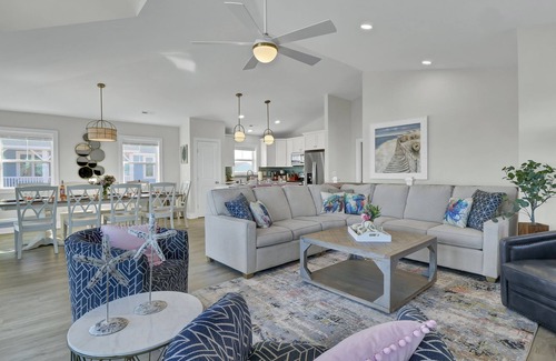 Escape to Tickled Pink, a stunning new construction home nestled in the heart of North Topsail Beach, offering a luxurious and relaxing getaway for families, friends, and couples seeking an unforgettable beach vacation. This beautifully appointed home boasts a spacious layout, an expansive private backyard with a resort-style heated pool, and easy access to the pristine sands of North Topsail Beach.