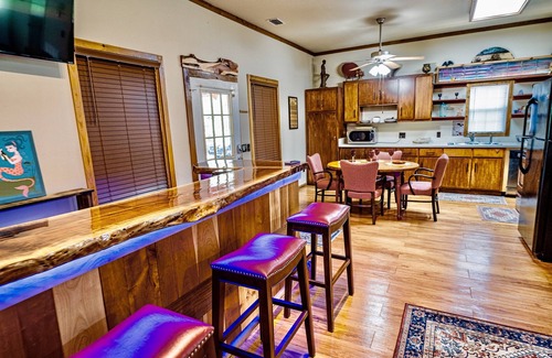 Feel pampered in your self contained Guest House with full bathroom, open concept living room with full kitchen. Luxurious and whimsical at the same time. Handmade exquisite wooden bar ready for you to enjoy. Private entrance, keyless entry. Luxurious spacious bathroom with full bathtub and shower. Luxurious red lunge sofas set the mood in this romantic fun getaway. Two separate bedrooms each with a king size bed, and closet.