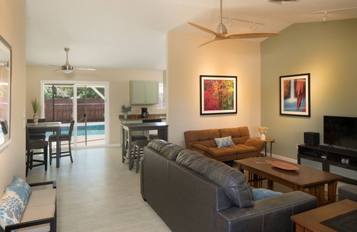 Both bedrooms have king beds with pillow toppers, and desks for the business traveler. The Living Room has a fold-down futon sofa bed suitable for children to small adults, and very plush sofa & loveseat for a very relaxing stay. Please note that due to the pool children are allowed WITH PARENTAL SUPERVISION. Rent at your own risk. Please note that since there is a pool, children are allowed but only WITH STRICT PARENTAL SUPERVISION. You are renting at your own risk.