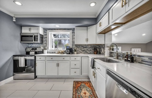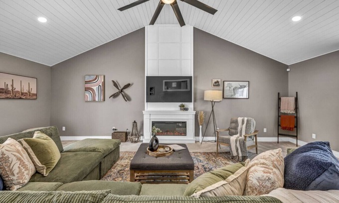 The kitchen features quartz countertops and plenty of space for cooking and preparing meals. The dining room has seating for 8. The large living room has vaulted ceilings and an electric fireplace for those cooler nights. On the first floor, there are 2 bedrooms, each with queen beds, as well as a full bathroom. The upstairs features the master bedroom equipped with a king bed, TV, and a desk when you have to bring work with you. The partially finished basement features a pull out full couch (small but perfect for 2 kids or 1 adult),, 2 arcade games, foosball, and a retro Nintendo 64 with 4 controllers and plenty of game options.