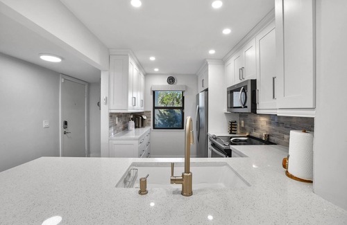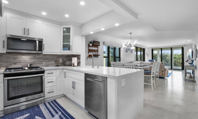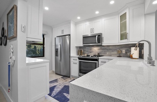 This beautiful 2/2 condo pool view, located on the first floor corner unit. A wrap around porch will allow renters to store their bike and easily cruise around in the pleasant-around weather and experience fantastic restaurants and pristine beaches ( Bicycle not included), direct beach access. We are sanitizing / disinfecting between guest for you safety, everything you need is provided for. kitchen fully equipped, water fall quartz countertop new stainless steel appliances, Bathrooms re-done tile floor throughout, this condo has one 65" TV in the Master bedroom and a 65" TV in the living room, full size washer /dryer, motorized shades for your privacy This unit has new impact windows throughout, step out and enjoy our heated pool, gym and club house.
