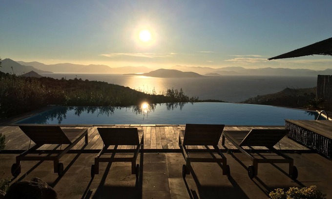 Best-rates for the Kontos villa starts from $479 per night with includes Kitchen, Laundry, Pool, TV, View, Wellness Facilities, Child Friendly, Parking, Entertainment, Internet, Air Conditioner, Other, Ocean View, Balcony/Terrace, Sports/Activities, Bedding/Linens, Fireplace/Heating, Barbecue/Outdoor Cooking, Private Pool, Security/Safety, Hot Tub with all other amenities. Perfect for Weddings is committed to ensuring every guest experiences a comfortable and extraordinary stay, whether planning a romantic getaway, a honeymoon, a pet-friendly stay, or celebrating with the entire wedding party.