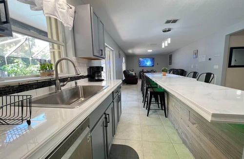 Just minutes from Port Canaveral, relax and recharge at the Tiki Oasis—your perfect pre- or post-cruise home. Enjoy a spacious backyard with a beautiful poolside Tiki bar, large grilling station, firepit with ample patio seating, and a hammock shaded by palm trees—ideal for families or groups.