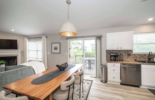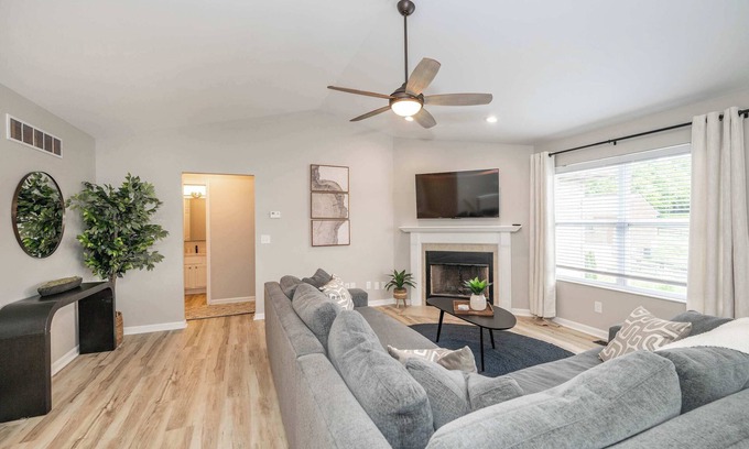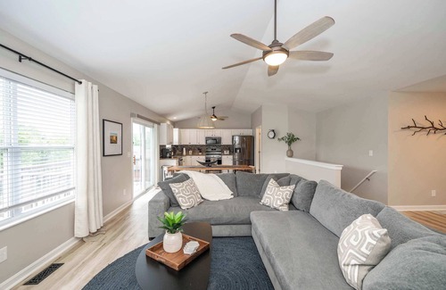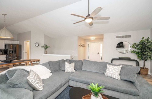 The home’s fresh and modern interior will make you feel immediately at home among comfortable furnishings, soothing neutral tones, and sophisticated décor. Unwind in the spacious living room on plush sofa seating while you queue up a movie on the mounted TV. The open floor plan organically leads you into the stylish kitchen, fully equipped for preparing meals large and small and showcasing stainless steel appliances, stone countertops, and sleek white cabinetry stocked with cookware and dining ware. Gather together at the dining table with seating for 6 for formal meals and energetic family game nights alike. To get your competitive juices flowing, head downstairs to the game room and rack up a game or two of pool while a second living area nearby offers a more secluded entertainment experience.