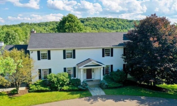 Our home is nestled on 15 stunning, natural acres. You will arrive on our semicircular driveway (large enough for 10+ vehicles) and pull up in front of our beautiful colonial home, surrounded by mature trees and all the green you could ever wish for.