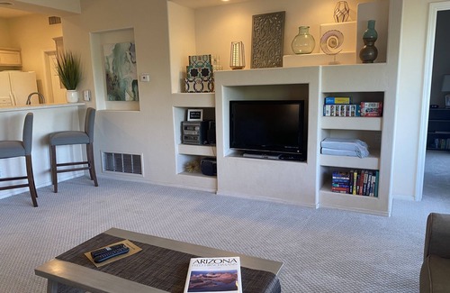 We have a charging station so you can enjoy the free Wi-fi and relax in the spacious living room with a flat screen TV. The kitchen is ready for you to brew some coffee or mix an afternoon margarita that you can savor on the balcony overlooking the heated pool and gorgeous Catalina Mountain views. We even have pool towels waiting for you!