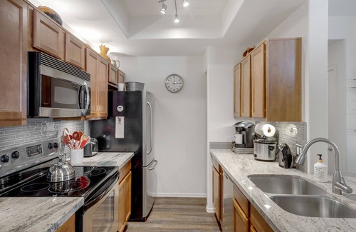 The full kitchen - with granite countertops, glass tile backsplash, under cabinets lighting, stainless steel appliances and under mounted large sinks - is well stocked with all sorts of useful gadgets like a crock pot, a regular and a Keurig coffee maker (your choice!), a mini chopper (it is obligatory for you to make salsa while in AZ), pie tins, etc. in case you get exhausted trying out all the restaurants and eateries around.