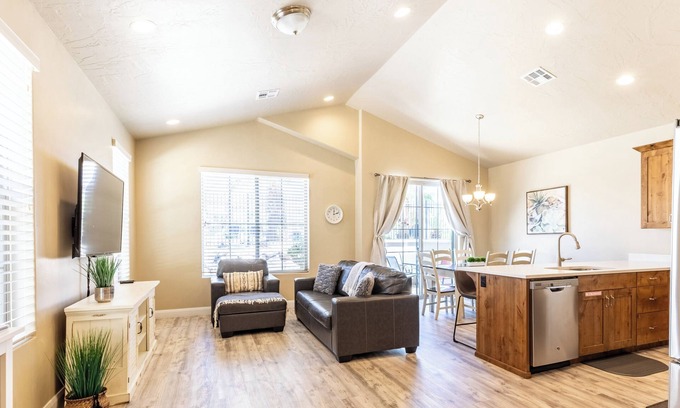 Featuring three-bedroom master suites featuring private bathrooms and walk-in closets in each bedroom. The 1st master suite "The Greece Room" is located on the main floor featuring a king and an LG TV. The second master suite, "The London Room" is located on the 2nd floor featuring a queen, pull-out sofa sleeper with memory foam and LG TV. The third master suite, "The Paris Room" is also located on the second floor featuring a King, sofa sleeper with a queen memory foam mattress pad, LG TV, and pack-n-play. This beautiful St. George Vacation Home has been furnished for ultimate comfort. The mattresses are top-of-the-line to ensure that our guests get a good night's rest. The living room has two comfy sofas, and LGTV to watch some of your favorite movies! The kitchen is fully stocked with all the comforts of home. In addition, the kitchen has quartz countertops and stainless steel appliances. Bedroom configurations are 2 king, 1 queen, and sofa sleeper. We provide all linens, towels, wifi, Direct TV, and a supply of bath products. Close to biking, hiking, sand dunes, Sand Hollow State Park, Zion Natl. Park, Bryce Canyon, Tuachan outdoor theater, Snow Canyon. Coral Canyon Golf Course is minutes away. Enjoy the luxurious golf and experience the breathtaking views. This course is a 7,029-yard, par-72 layout. Let us book your tee time!