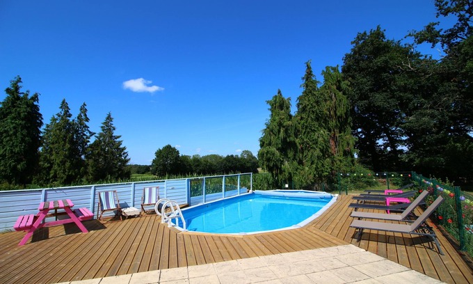 Shared Heated outdoor pool open from end of May to September. Deck area with sun-loungers and garden furniture. The pool is shared with one other gite.