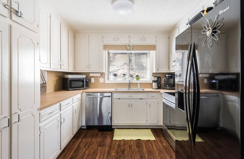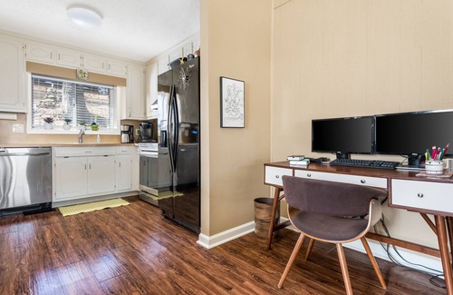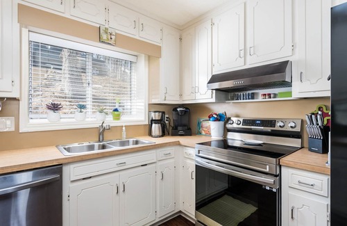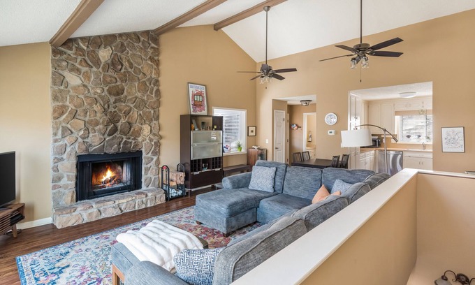 Great 2 story floor plan with lots of space and an oversized deck. High speed internet, work desk, smart TV's, blue tooth speaker and kitchen is fully equipped with all kinds of gadgets and spices. Gourmet Coffee provided along with some pantry items. Nice bright, living space with soft, large sectional and fun airline travel themed accessories. Bedrooms are downstairs and each has full bathroom. Full size washer & dryer is next to the bedrooms, detergents provided.