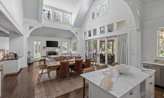 - Expansive Entertaining Space: The great room seamlessly opens to a screened-in porch through folding glass doors, creating an inviting atmosphere that integrates the natural beauty of Palmetto Bluff with your celebration.