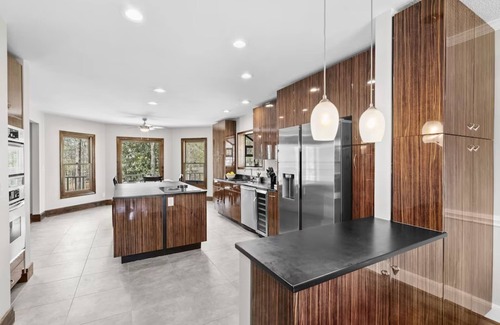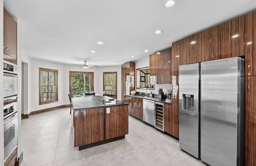Once inside, guests are greeted with a warm, inviting foyer with access to the primary bedroom and the dining area. The large dining area seating eight is adjacent to the large, modern kitchen. The kitchen features Italian Tigerwood laminate kitchen cabinetry and slate counters! The fully stocked kitchen, flanked by eating areas on each end, is perfect for preparing all your meals. The kitchen opens to a light, bright family room with built-ins, comfy seating options, and a large TV. From the family room, there is access to the back deck, which is the full length of the house!