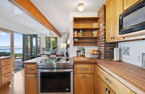 The unique 4-bedroom layout offers a charming nautical feel, featuring 'boat stairs' to access three of the bedrooms across 5 different levels of the house. Porpoises grace the bay, while eagles, seals, otters, and salmon add to the vibrant wildlife experience.
