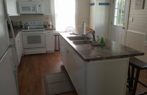 Sunny and contemporary kitchen with dishwasher, stove, microwave and full size refrigerator. Eat in style with seating for all. All new cabinets. All new appliances. Includes all the conveniences.