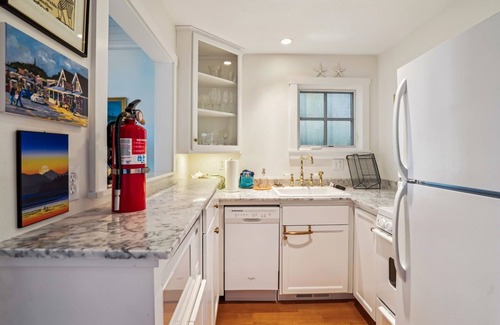 Starting in the great room again and exploring the right side of the house, you’ll walk through a set of French doors into another inviting living area. This one features a large brick fireplace and comfortably seats seven. Large west-facing windows let in plenty of light and a telescope invites you to search the distant waves for whale spouts. Next to this living area, you’ll find another full kitchen that is a tad smaller than the one on the other side of the house. Just down the hall from the kitchen is a bathroom with cheerful blue tiles and a walk-in shower. Past the bathroom, the hallway opens into a small sitting area with a tv and room for four, just right for reading that last bedtime story to a kiddo or catching the end of an overtime game without keeping everyone else in the house up late. At the end of the hallway, you’ll find a bedroom with a king-sized bed and lots of light filtering in through its east-facing windows. Just a few steps from this room, you’ll find more French doors welcoming you back into the beautiful great room.