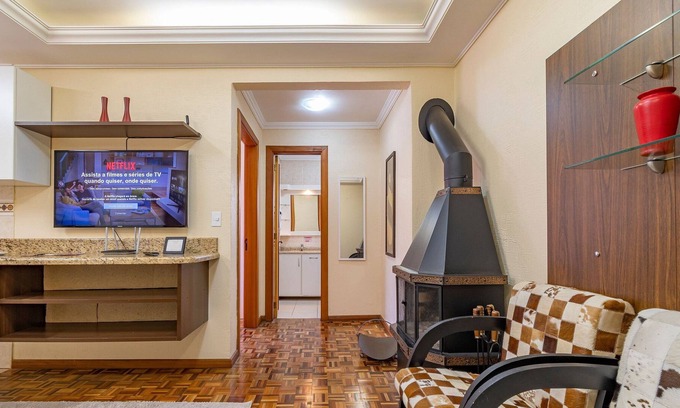 Apartamento Portinari, acomoda até 4 pessoas com uma vaga de garagem, lareira, e cozinha bem equipada.