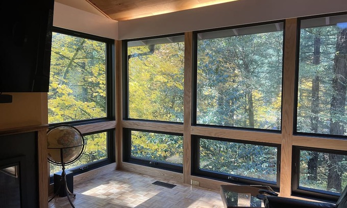 In the Tualatin Mountains 2 miles from downtown Portland you will be sitting on the edge of a densely wooded ravine surrounded by 125 foot tall trees. In Less than 10 minutes walk you are in Washington Park and the Hoyt Arboretum. Standing looking out floor to ceiling living room windows all you see are trees. No steps to get into the home but you are over 3 stories up looking out. Very comfortable main living area with master bedroom and bath on one end of the house and second bedroom and bathroom on opposite side with a door at the end of the hall that makes it into it’s own private suite. Large back deck with gas grill. Lots of out outdoors space’s available. There is a lookout deck 2 levels down and go down one more level to a meditation space and a trail to the round spiritual spot deck. This is in one of the most beautiful areas in Portland